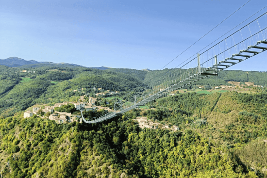 Il Ponte Tibetano di Sellano, lungo 517 metri e sospeso a 175 metri d’altezza, collega il borgo a Montesanto. Con 1023 passi regala adrenalina, panorami spettacolari sulla Valle del Nera e un’esperienza indimenticabile immersa nella natura.