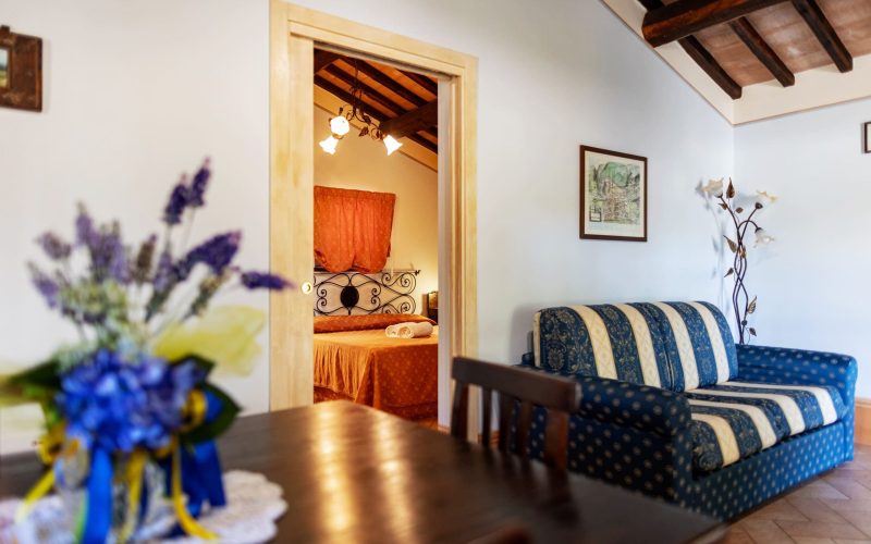 Bilocale di 50 mq con ampio porticato attrezzato con barbecue e forno a legna. All’interno: tinello luminoso con cucina completa e divano letto matrimoniale, camera matrimoniale e bagno in camera per portatori di handicap Il porticato è perfetto per pranzi all’aperto e serate conviviali. Soluzione comoda e riservata per 2–4 persone, ideale per coppie, famiglie o amici in cerca di relax.