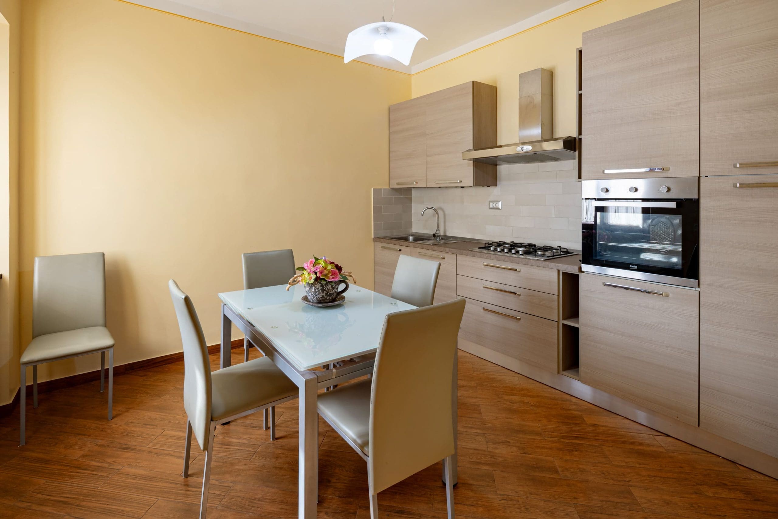 Appartamento di 90 mq. con terrazzo coperto, cucina completa di lavastoviglie, soggiorno, 2 camere matrimoniali, 2 bagni, per 4 persone.