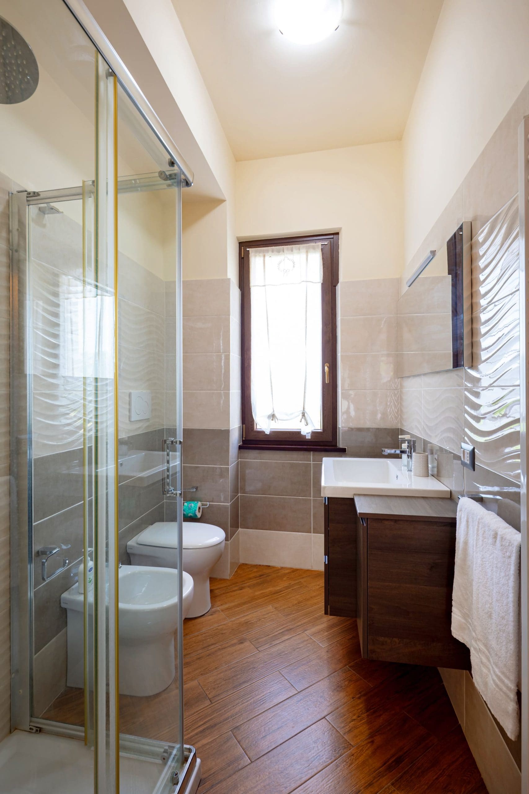 Bilocale su 2 piani di 80 mq. + terrazzo di 20 mq., al piano terra soggiorno con cucina, divano letto Matrimoniale, bagno, al piano superiore zona notte con letto matrimoniale, 2 letti singoli, bagno, per 4/6 persone.